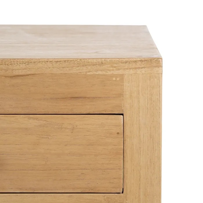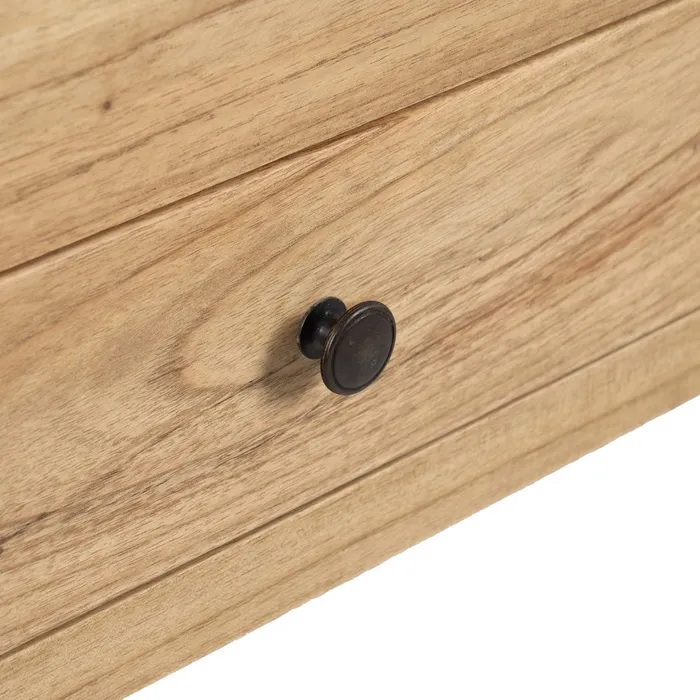Material: madera de mindi. Cajones: 38x10cm. Altura patas: 57,5cm. Altura reposapiés: 8cm. Distancia entre patas: 120cm. Peso: 27kg.