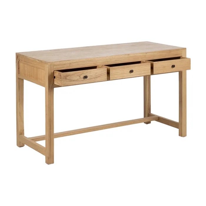Irresistible consola o escritorio, de diseño oriental e inspiración rústica, fabricada en madera mindi con bonito acabado natural. Tiene 3 prácticos cajones con tiradores metálicos.