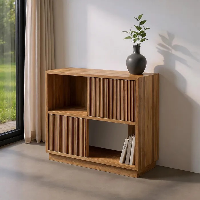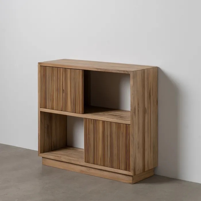 Irresistible aparador, de diseño rústico e inspiración nórdica, fabricado en madera reciclada de teka con acabado en color natural y puertas correderas alistonadas.
