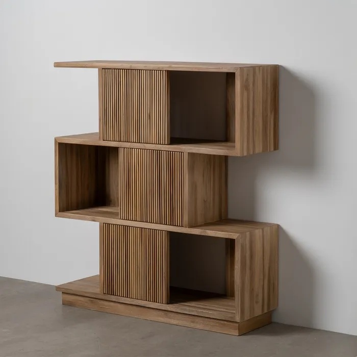 Irresistible estantería, de diseño rústico e inspiración nórdica, fabricada en madera reciclada de teka con acabado en color natural y puertas correderas alistonadas.