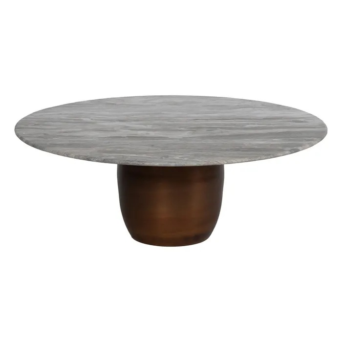 Set de 2 mesas de centro redondas, de diseño vintage es inspiración Art Decó, con base de metal en color marrón y precioso sobre de mármol blanco con marcadas vetas.
