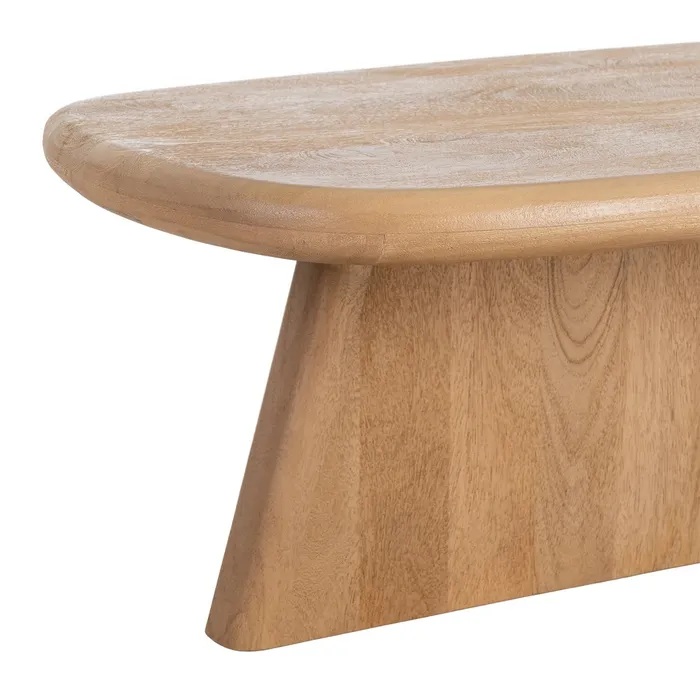 Irresistible mesa de centro, de diseño moderno e inspiración rústica, fabricada en madera de mango con bonito acabado natural. Con originales patas contrapuestas y cantos redondeados.