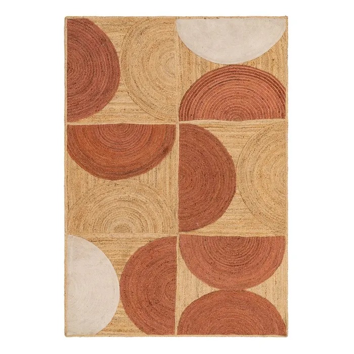 Preciosa alfombra, de diseño moderno e inspiración rústica, fabricada en yute con acabado natural y dibujos semiesféricos en tonos terracota.