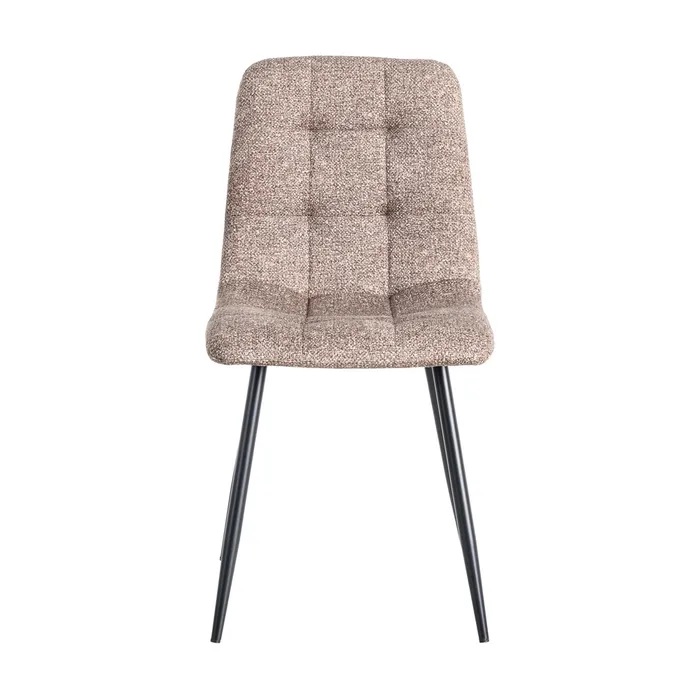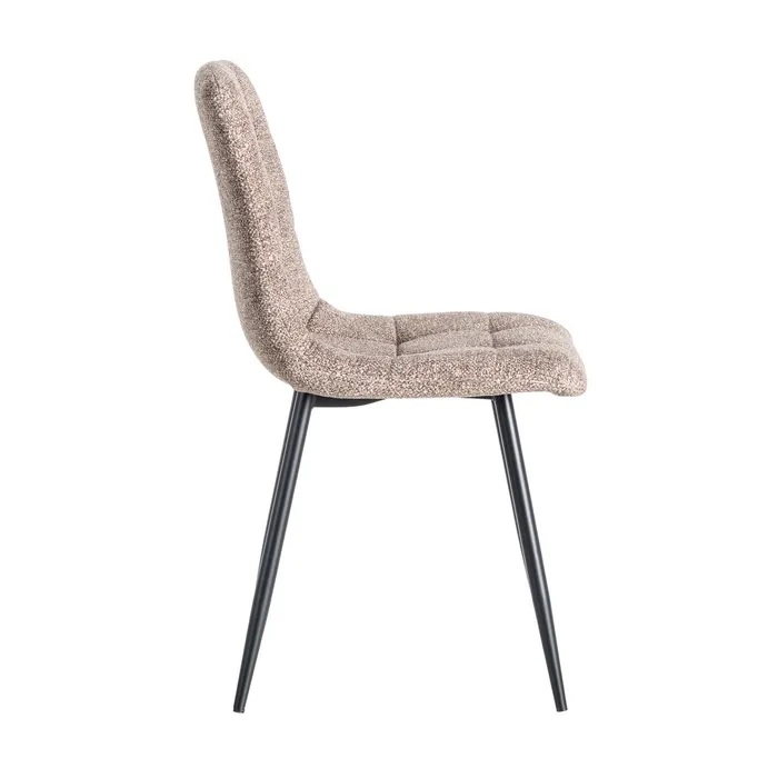 Elegante y confortable silla, de diseño moderno, con bonito tapizado jaspeado en color taupe y detalle de costuras de cuadrícula. Apoya sobre patas de metal en color negro.