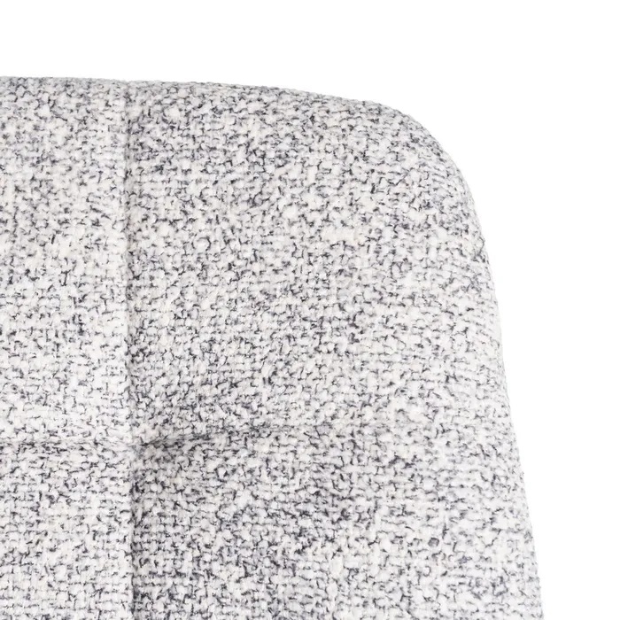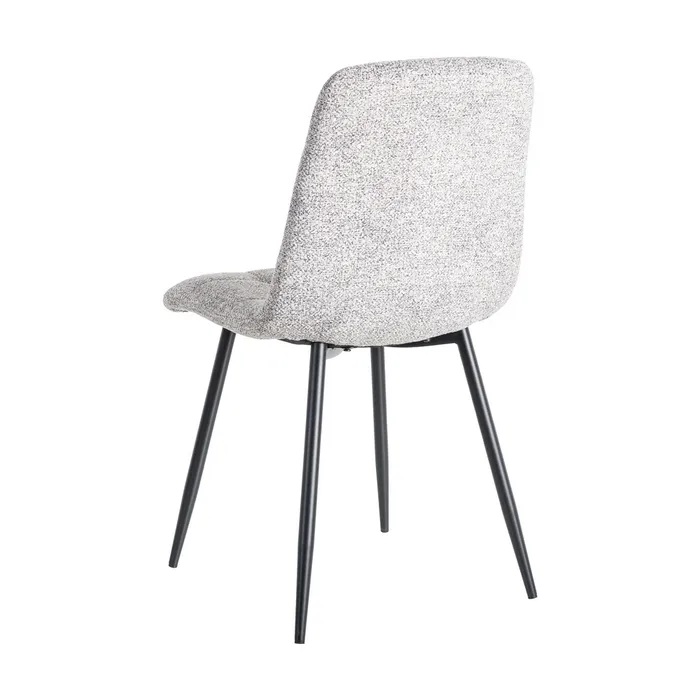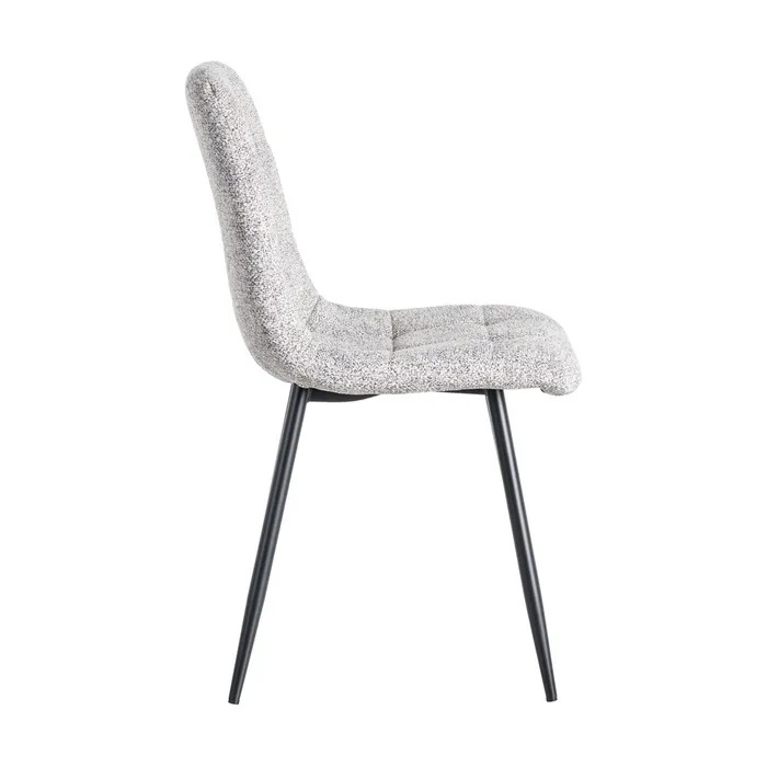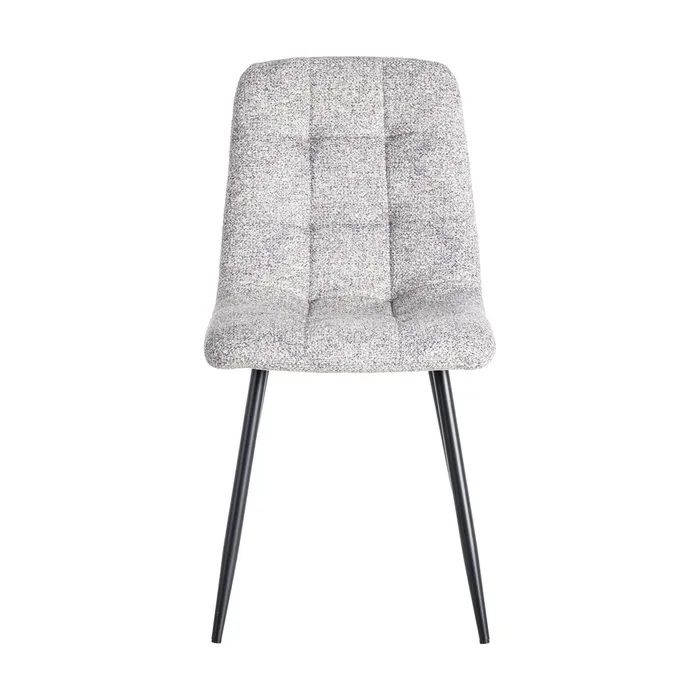 Elegante y confortable silla, de diseño moderno, con bonito tapizado jaspeado en color gris y detalle de costuras de cuadrícula. Apoya sobre patas de metal en color negro.