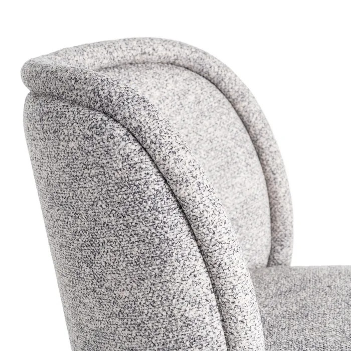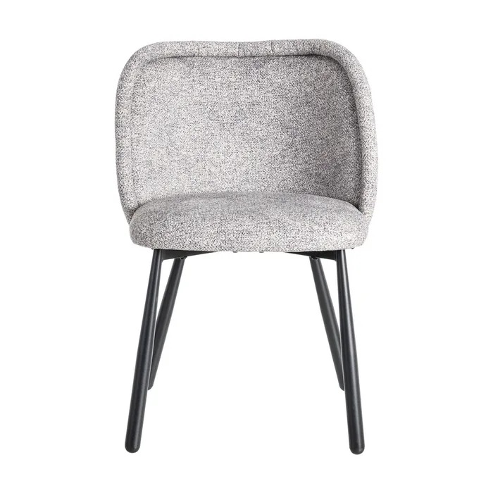 Elegante y confortable silla, de diseño moderno, con bonito tapizado jaspeado en color gris, respaldo asimétrico y patas de hierro en color negro.