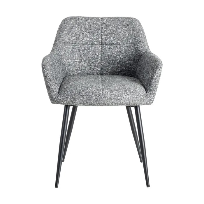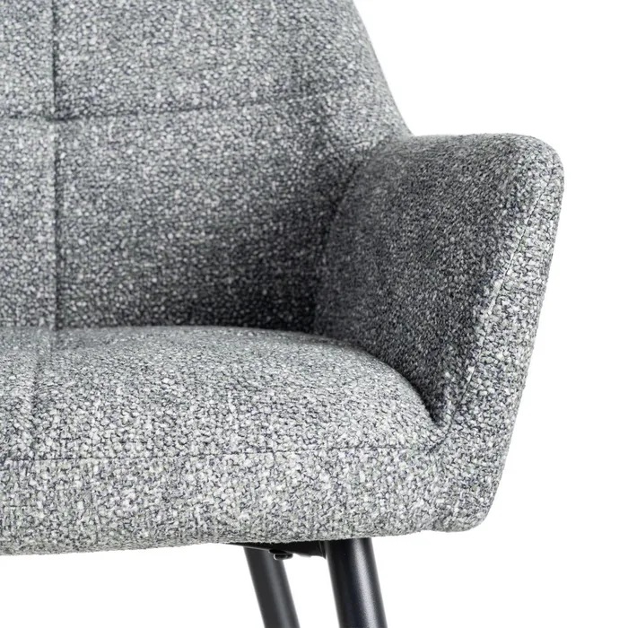Elegante y confortable silla con reposabrazos, de diseño moderno, con bonito tapizado jaspeado en color verde, detalle de costuras en cuadrícula y patas de hierro en color negro.