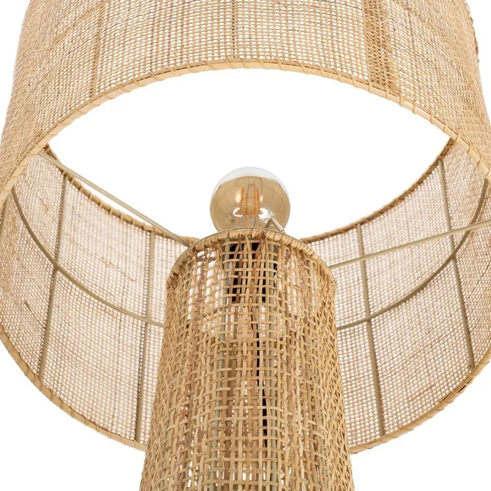 Material: ratán – metal Medida tulipa: 50x35cm. Medida base: 28x120cm. Peso lámpara: 3.7kgr. Casquillo: E27 Bombilla no incluida. Largo cable: 180-200cm. Peso: 8kg.