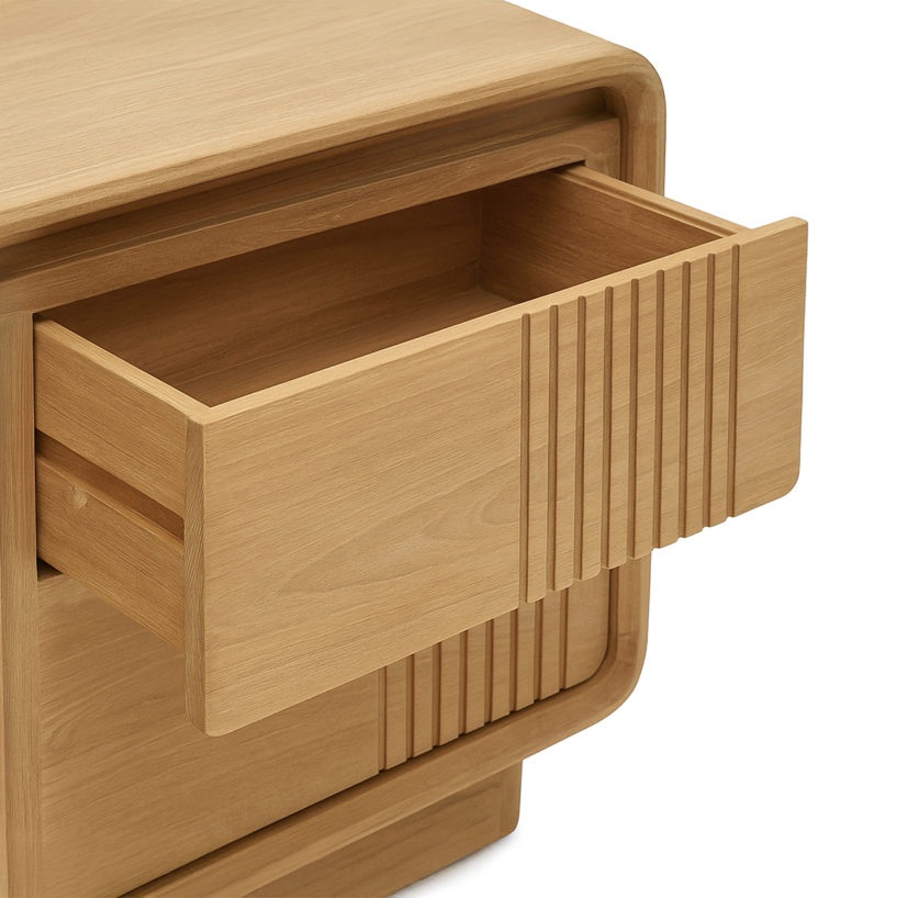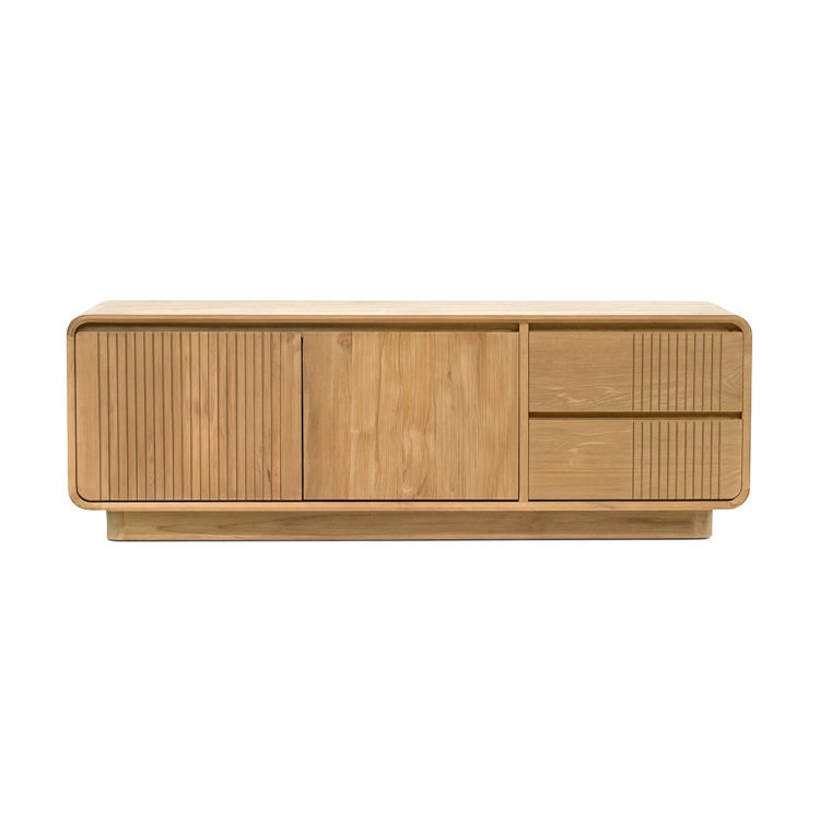 Irresistible mueble de televisión, de diseño rústico e inspiración nórdica, fabricado en madera maciza de teka con bonito acabado en color natural y detalle de ranuras verticales en el frente.