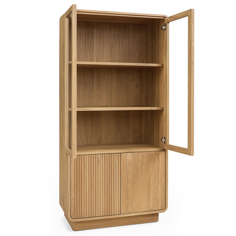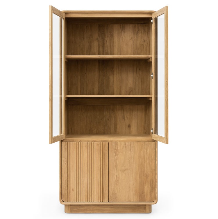 Irresistible vitrina, de diseño rústico e inspiración nórdica, fabricada en madera maciza de teka con bonito acabado en color natural, detalle de ranuras verticales en el frente y puertas acristaladas.