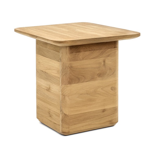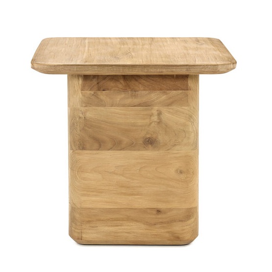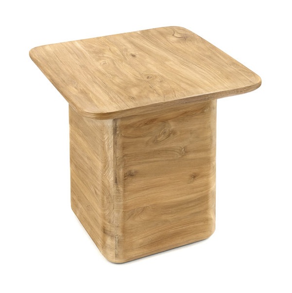 Irresistible mesa auxiliar cuadrada, de diseño rústico e inspiración nórdica, fabricada en madera maciza de teka con bonito acabado en color natural y robusta pata central.