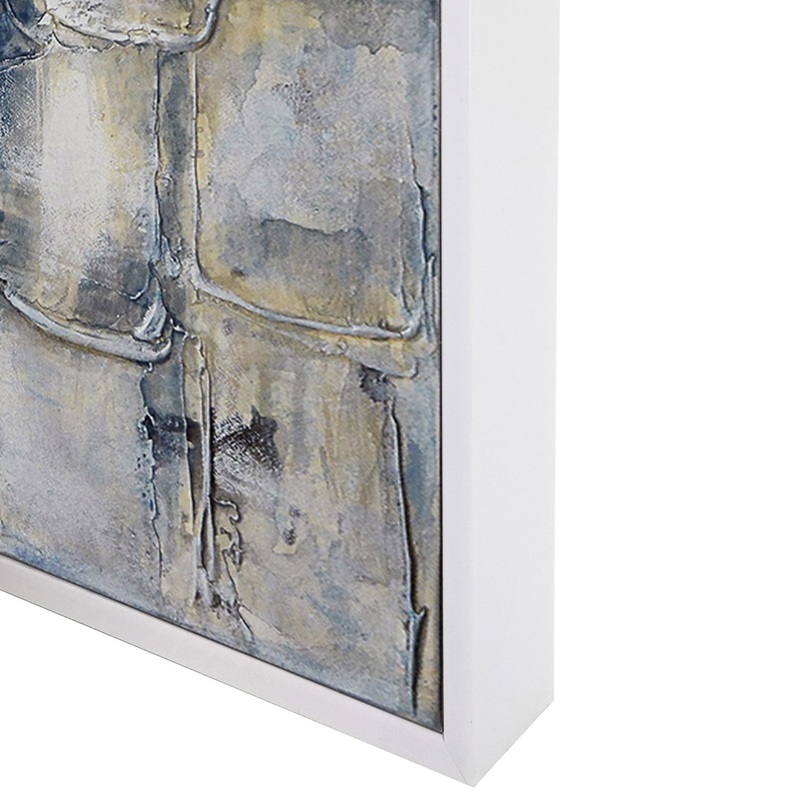 Original y colorido cuadro enmarcado de diseño abstracto pintado a mano con sus características formas geométricas en tonos azules.