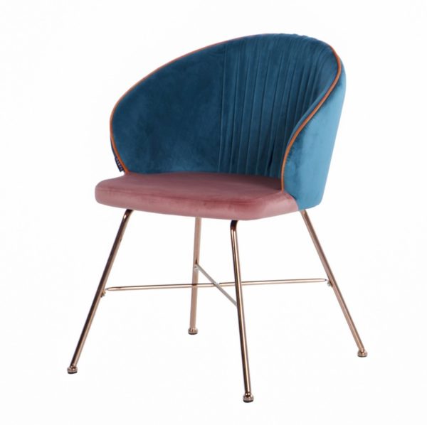 Sofisticada silla de diseño Art Decó e inspiración vintage con elegantes patas de metal en color cobre y tapizado en precioso terciopelo verde y rosa con detalle de costuras verticales en el respaldo y ribete en naranja.