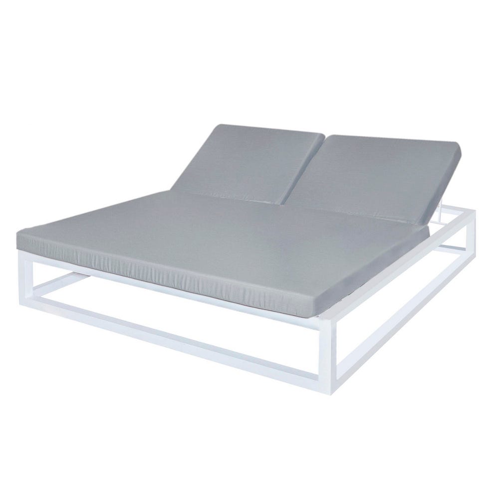 Elegante y confortable cama doble para exterior, de diseño moderno, con estructura de aluminio blanco y tapicería en color chateau.