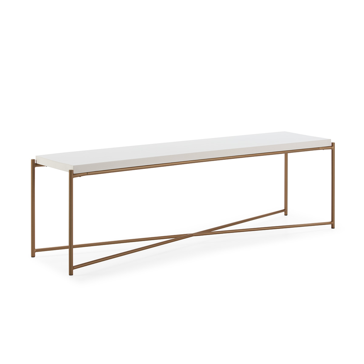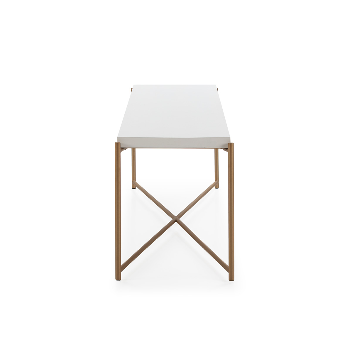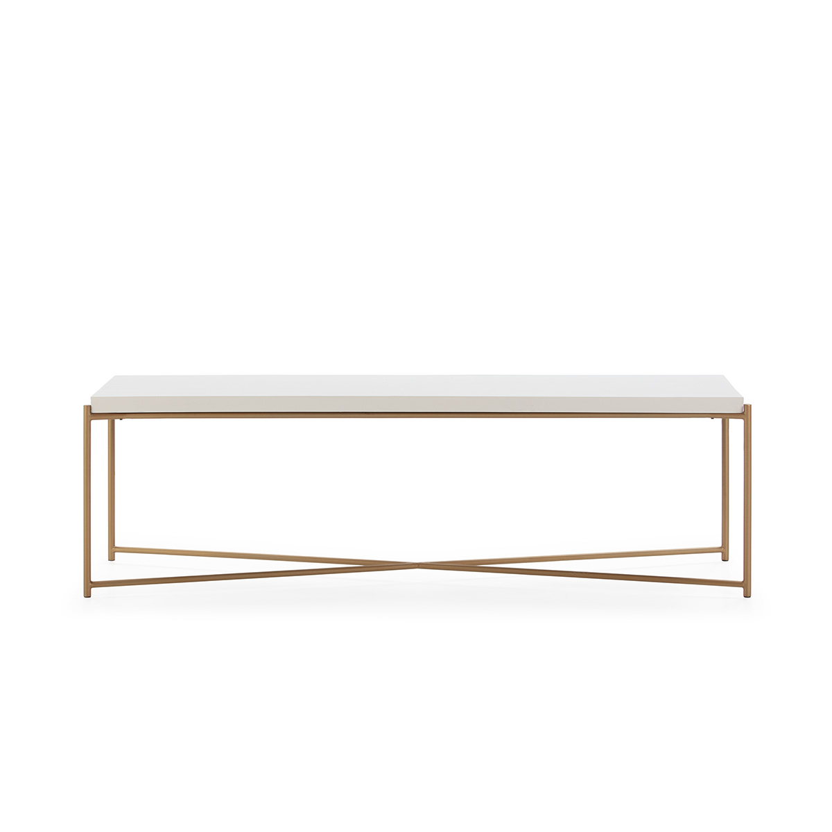Delicioso mueble de televisión de diseño vintage fabricado en madera acabado blanco con elegantes patas cruzadas de metal en color dorado.