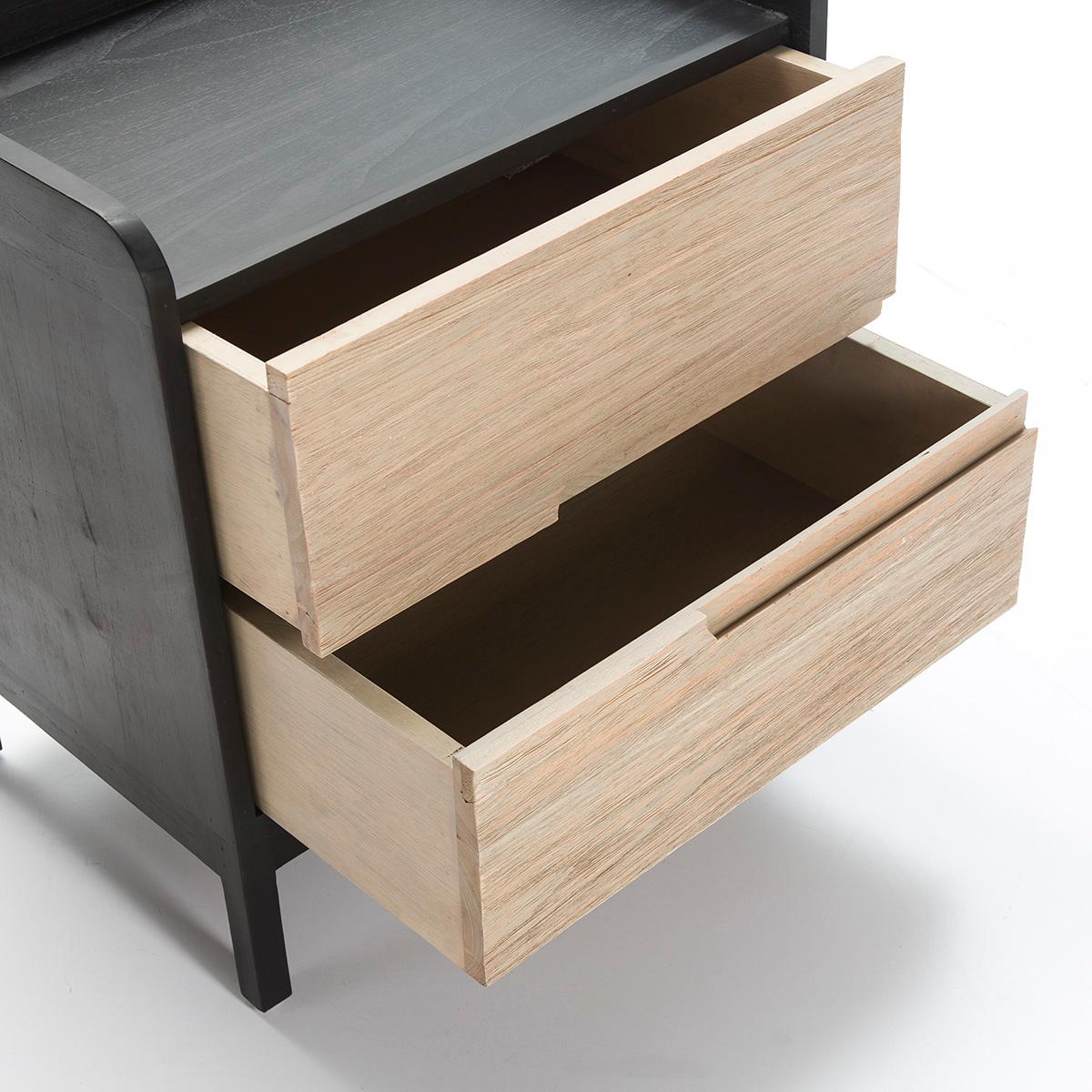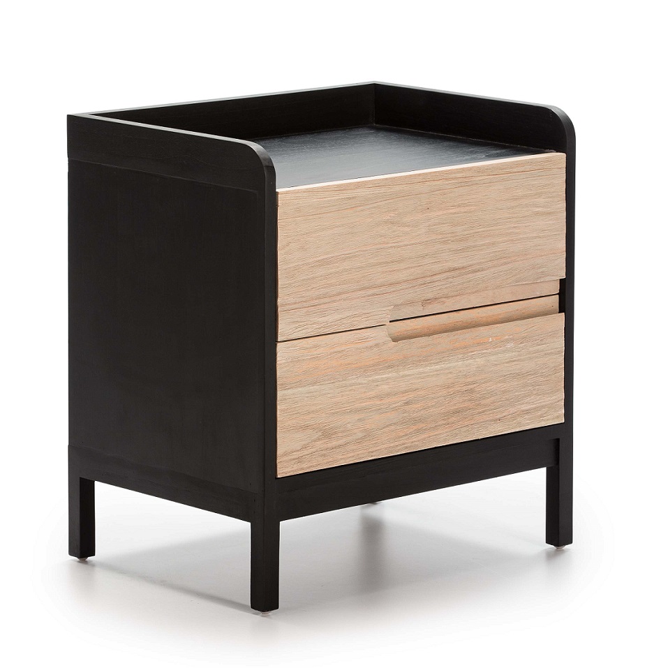 Preciosa mesita de noche de diseño nórdico fabricada en madera con elegante acabado en color negro y dos prácticos cajones en color gris.