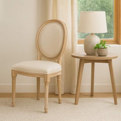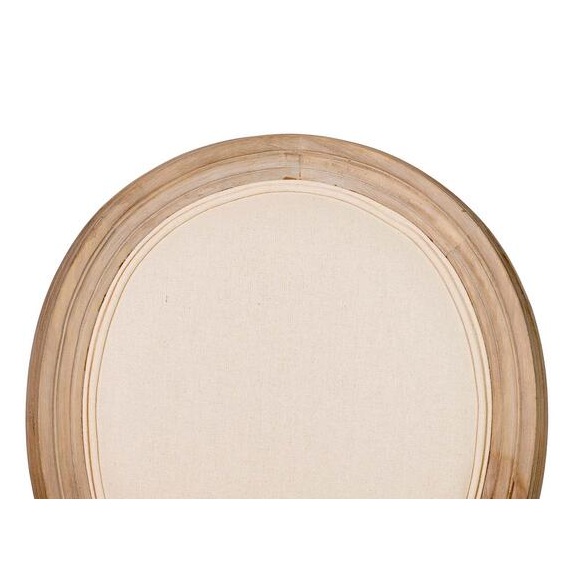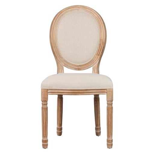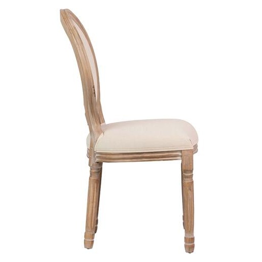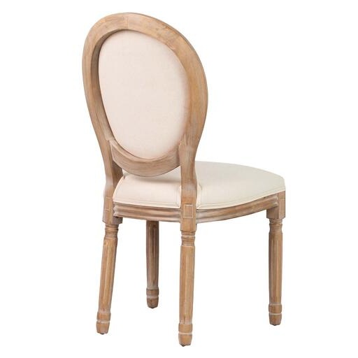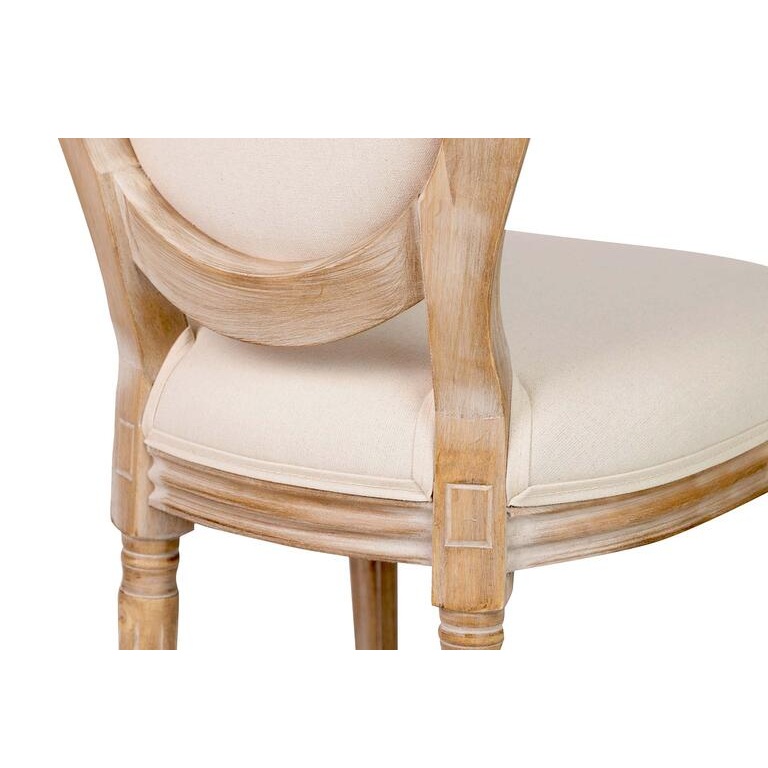 Preciosa y confortable silla, de diseño clásico, con estructura de madera en acabado natural y tapizado en lino beige con respaldo de medallón.