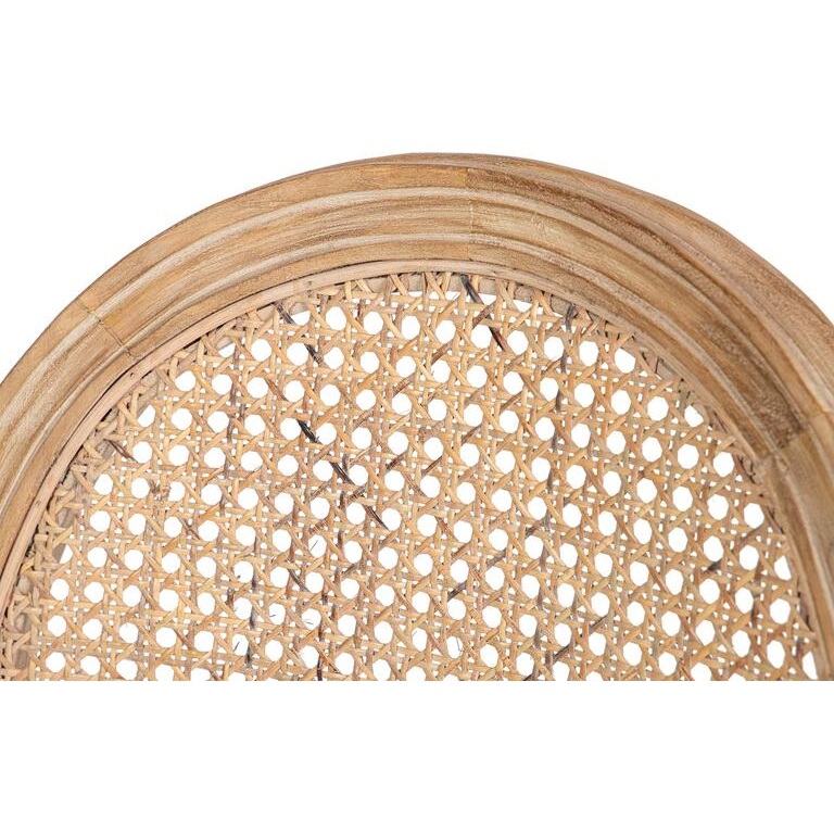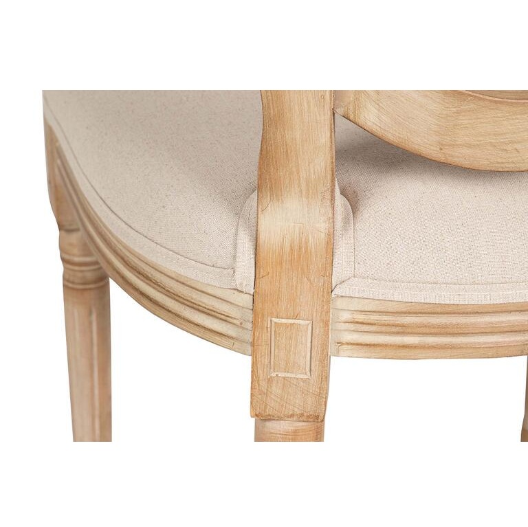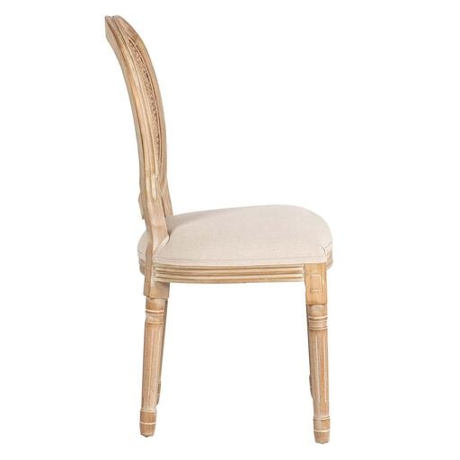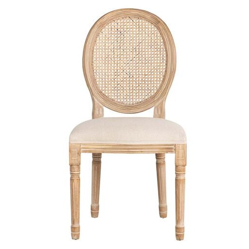 Preciosa y confortable silla, de diseño clásico, con estructura de madera en acabado natural y tapizado en lino beige con respaldo de medallón en rejilla.