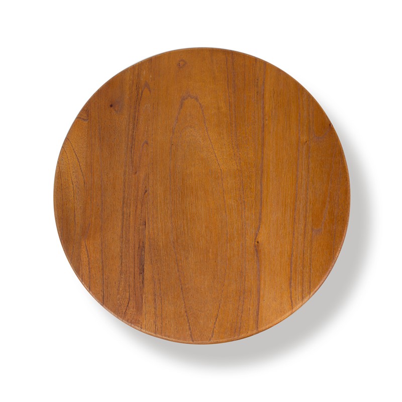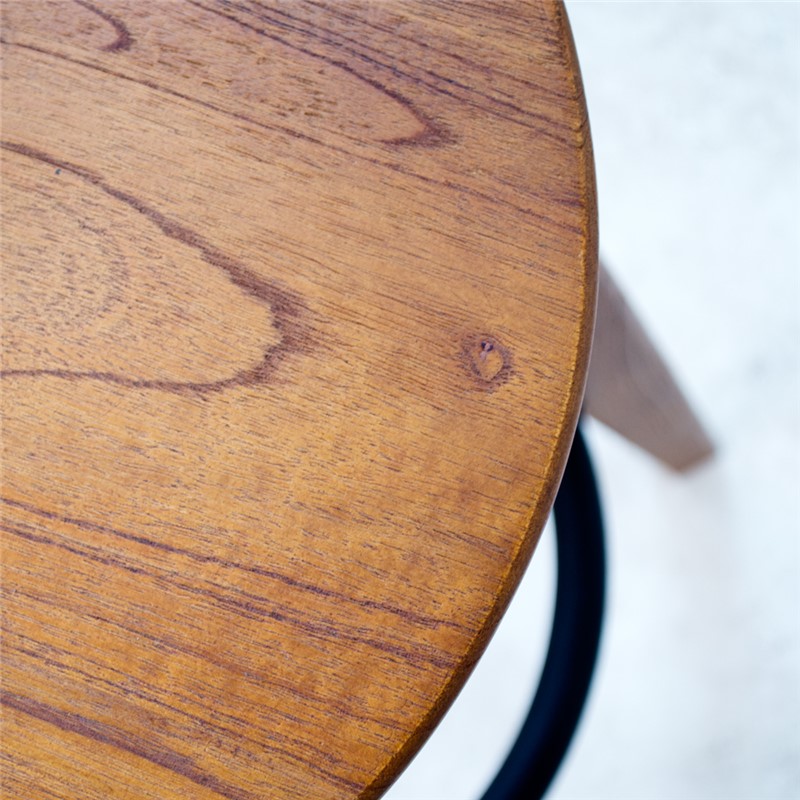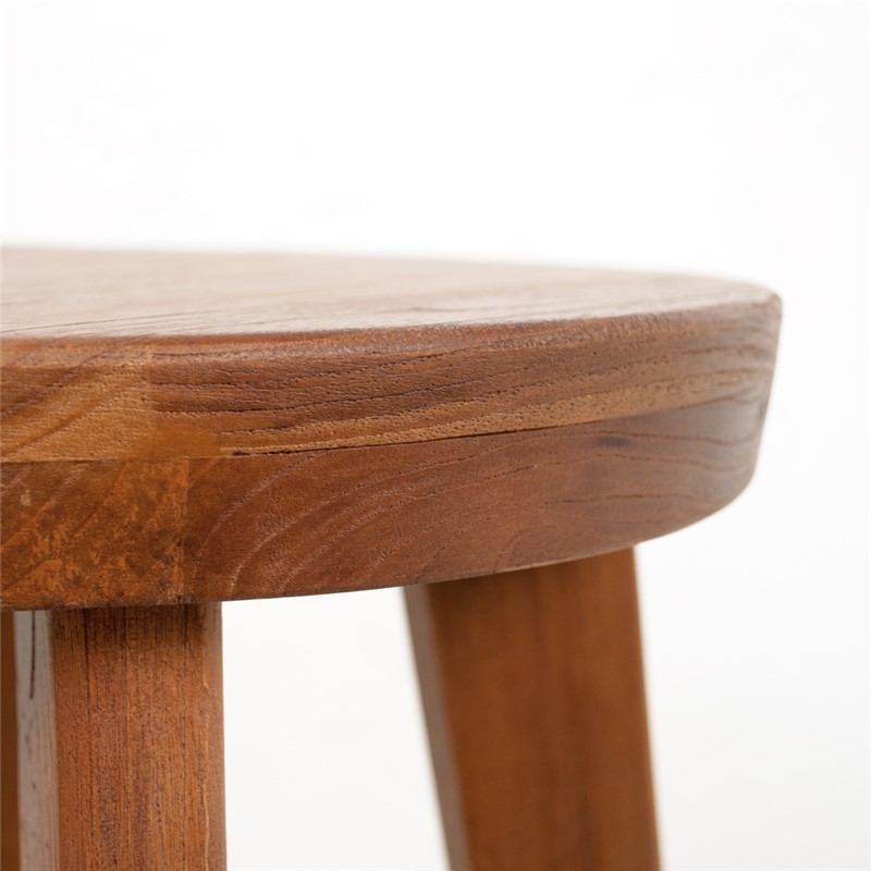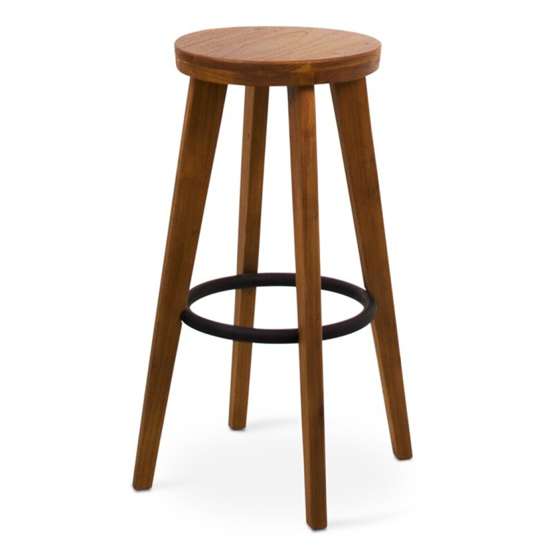 Elegante taburete alto, de diseño vintage e inspiración industrial, fabricado en madera de olmo en precioso color natural. Con asiento redondo y reposapiés de hierro en color negro.