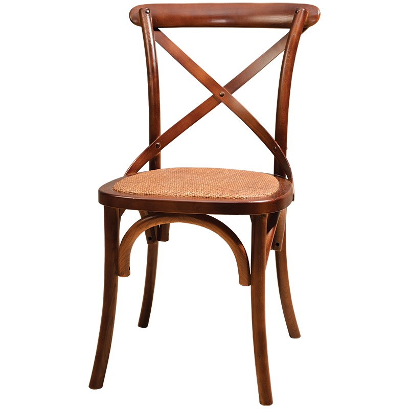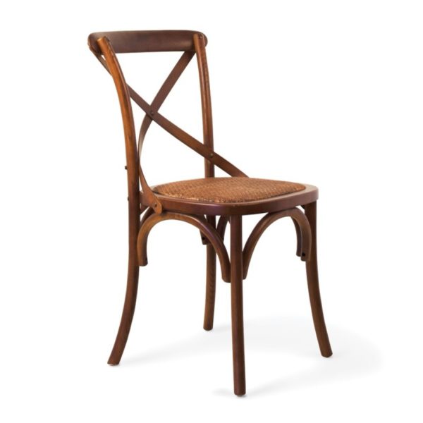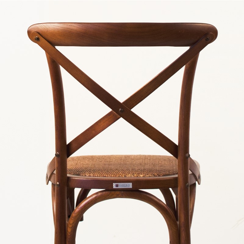 Silla de diseño inspiración Thonet con crucetas fabricada en madera de olmo con bonito acabado nogal combinado con asiento de rattán.