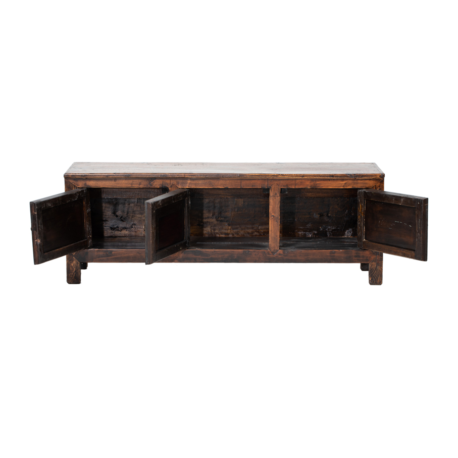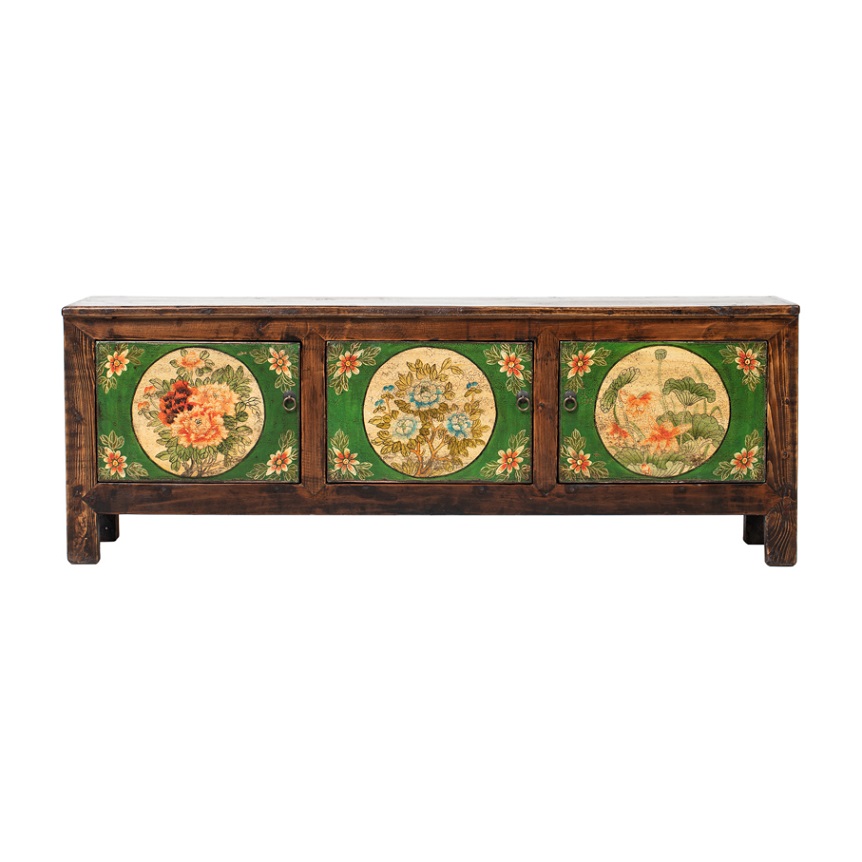 Precioso y trabajado mueble de televisión de diseño oriental fabricado en madera antigua de álamo con elegante acabado desgastado en color marrón y 3 puertas con delicados motivos florales multicolor.