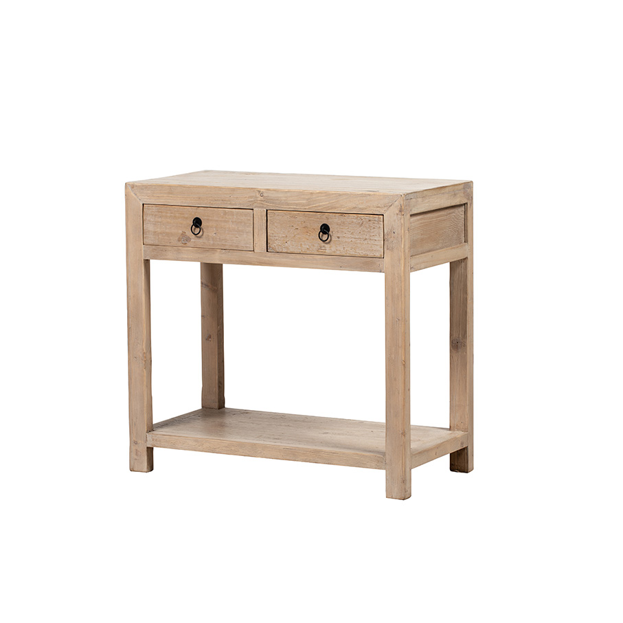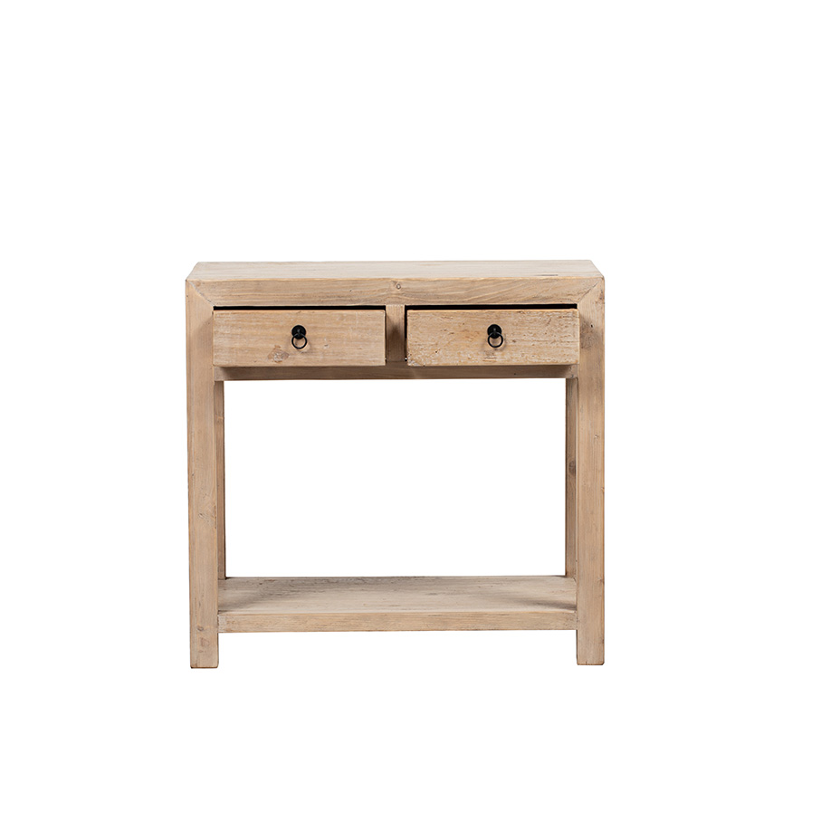 Preciosa consola de diseño oriental e inspiración rústica fabricada en madera de pino con elegante acabado en color natural. Tiene una práctica balda en la parte de abajo y 2 cajones con bonitos tiradores metálicos.