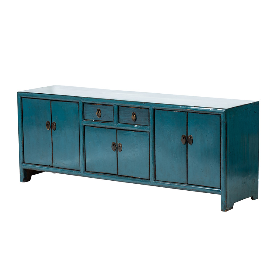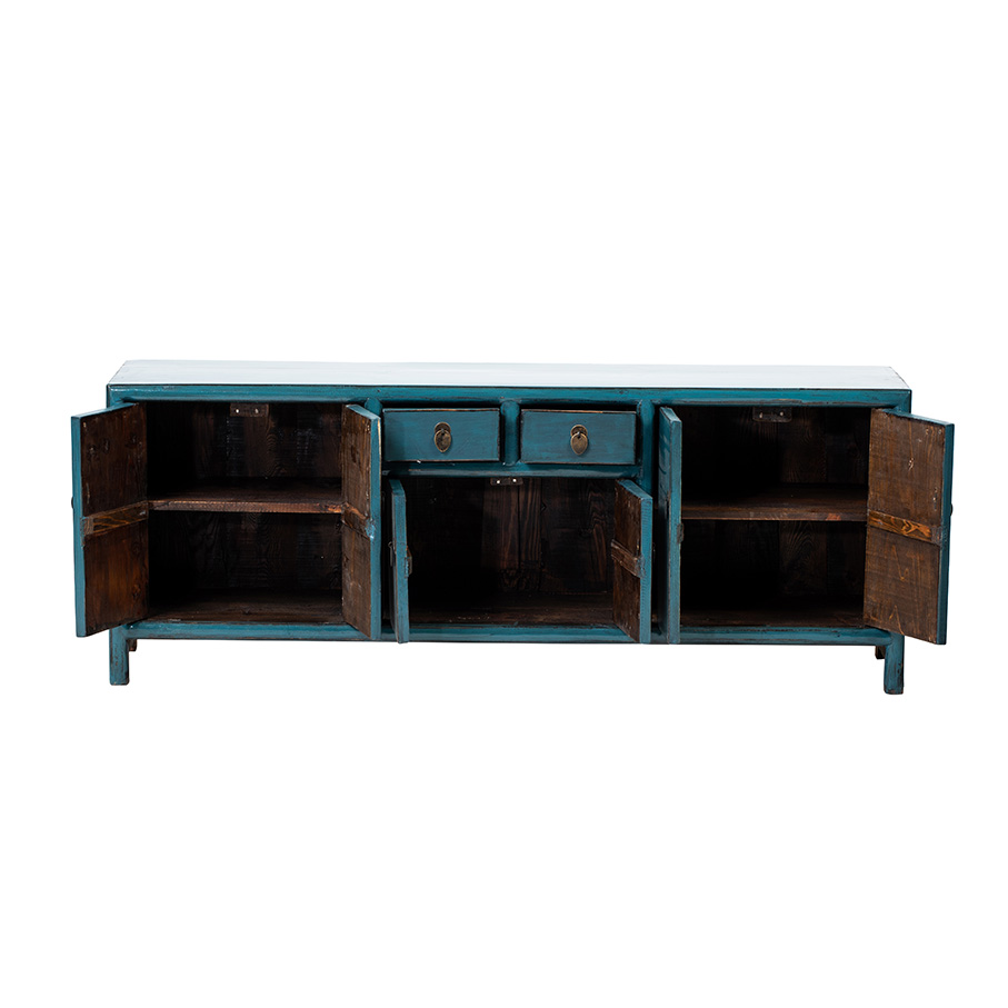 Sofisticado mueble de televisión de diseño oriental fabricado en madera antigua de pino con elegante acabado desgastado en color azul. Tiene 6 puertas y 2 cajones con bonitos tiradores metálicos.