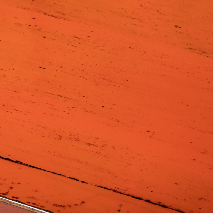 Sofisticado mueble de televisión de diseño oriental fabricado en madera de olmo con original acabado desgastado en color naranja. Tiene una balda interior removible y 6 puertas con bonitos tiradores metálicos.