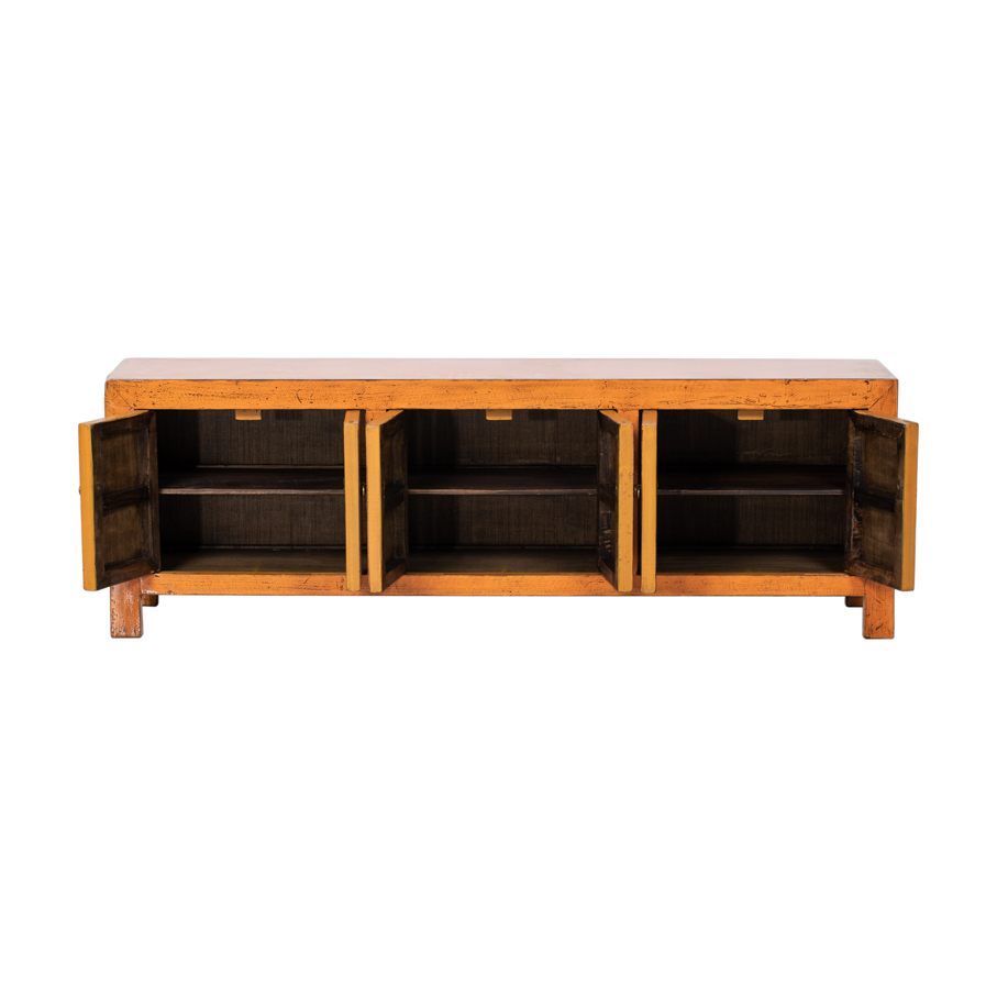 Precioso mueble de televisión, de diseño oriental e inspiración vintage, fabricado en madera de olmo con original acabado desgastado en color naranja. Tiene 4 puertas con bonitos tiradores metálicos.