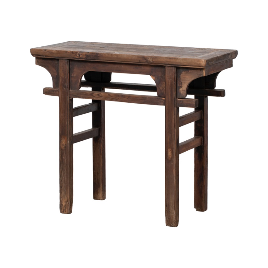 Coqueta consola, de diseño oriental e inspiración rústica, fabricada en madera antigua de olmo con original acabado desgastado en color natural.