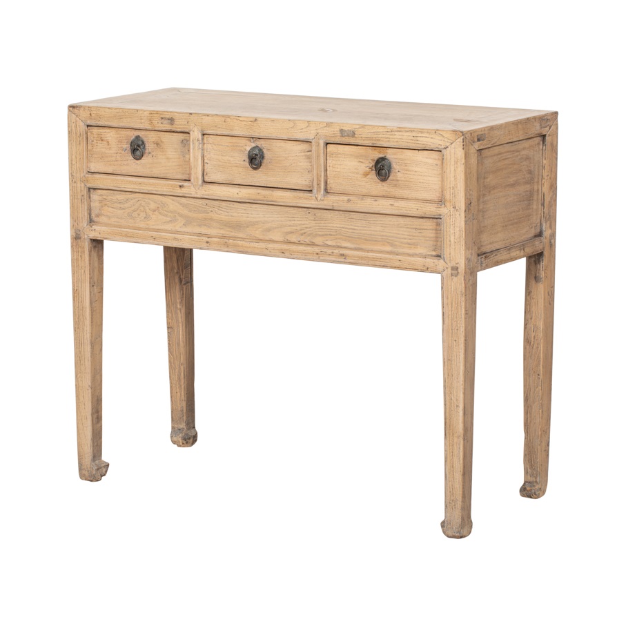 Coqueta consola, de diseño oriental e inspiración rústica, fabricada en madera antigua de álamo con original acabado desgastado en color natural y 3 prácticos cajones en el frente con bonitos tiradores metálicos.