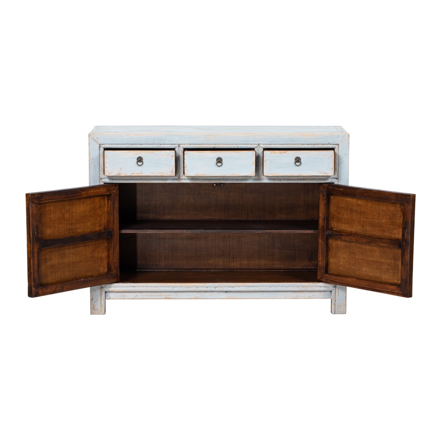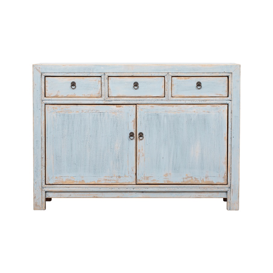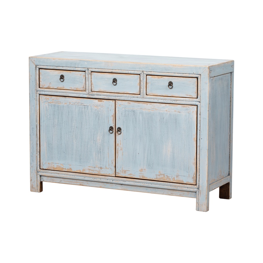 Irresistible aparador, de diseño oriental e inspiración rústica, fabricado en madera de olmo con original acabado desgastado en color azul claro. Tiene 2 puertas y 3 prácticos cajones con bonitos tiradores metálicos.