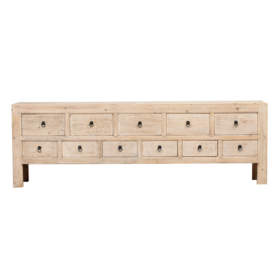 Espectacular cómoda de gran tamaño, de diseño oriental e inspiración rústica, fabricada en madera de pino con original acabado envejecido. Tiene 11 cajones con bonitos tiradores metálicos.