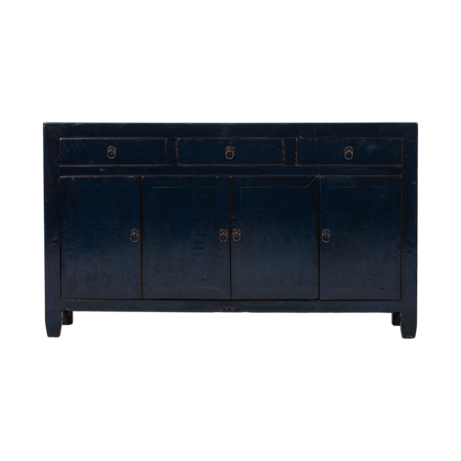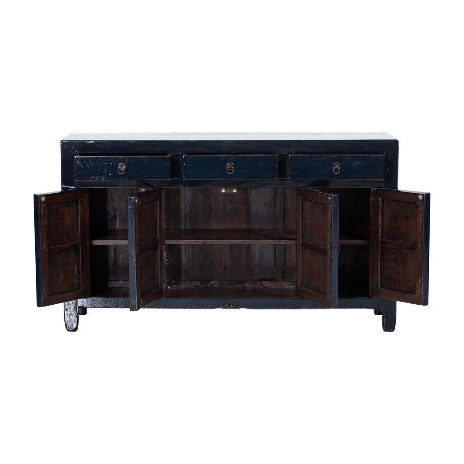 Irresistible aparador, de diseño oriental e inspiración rústica, fabricado en madera reciclada de pino con original acabado negro envejecido. Tiene 4 puertas y 3 prácticos cajones con bonitos tiradores metálicos.