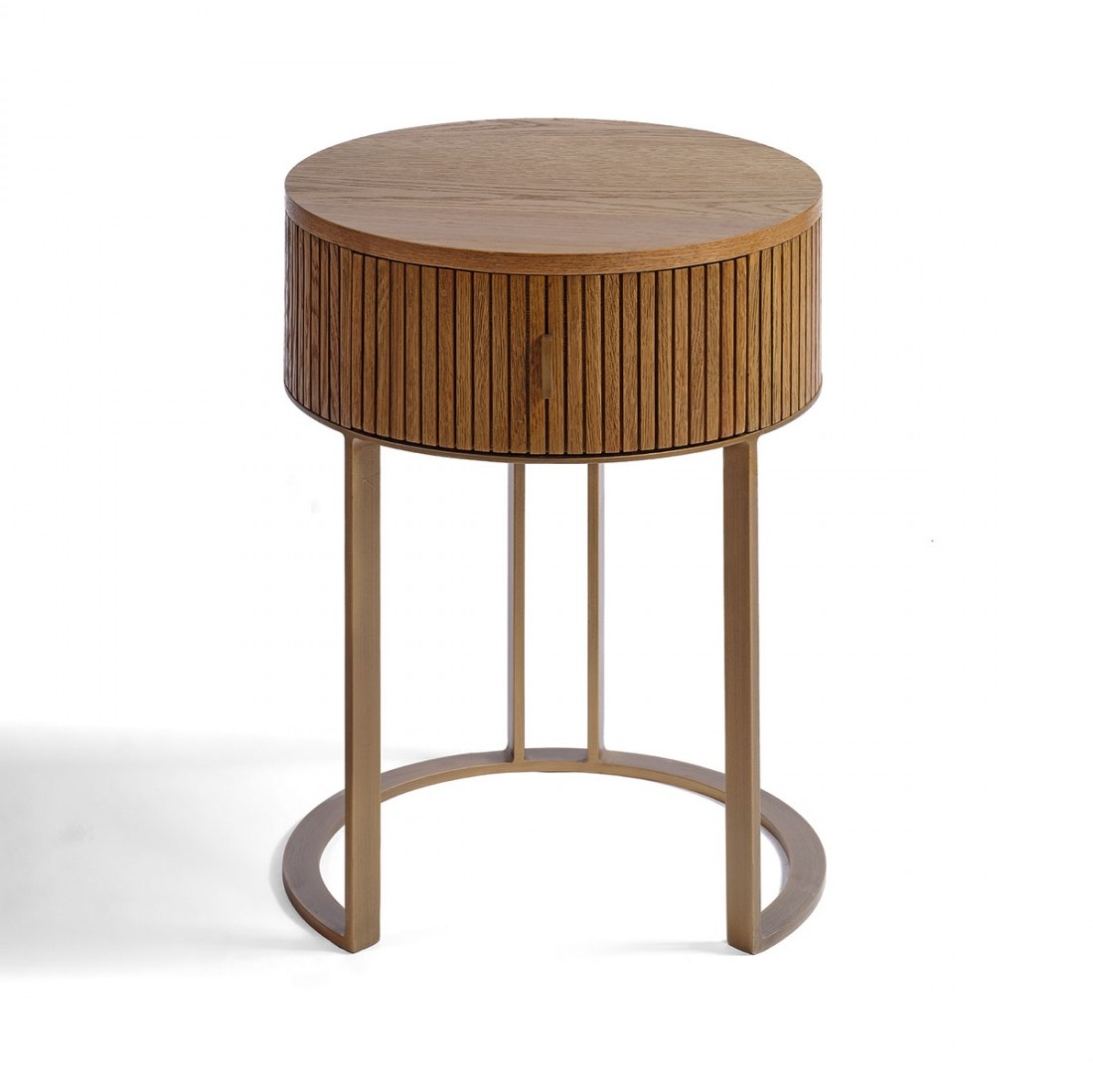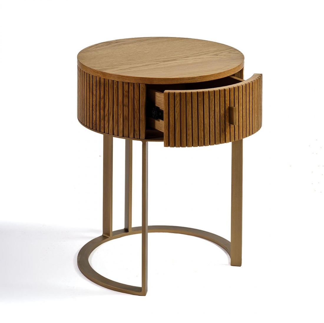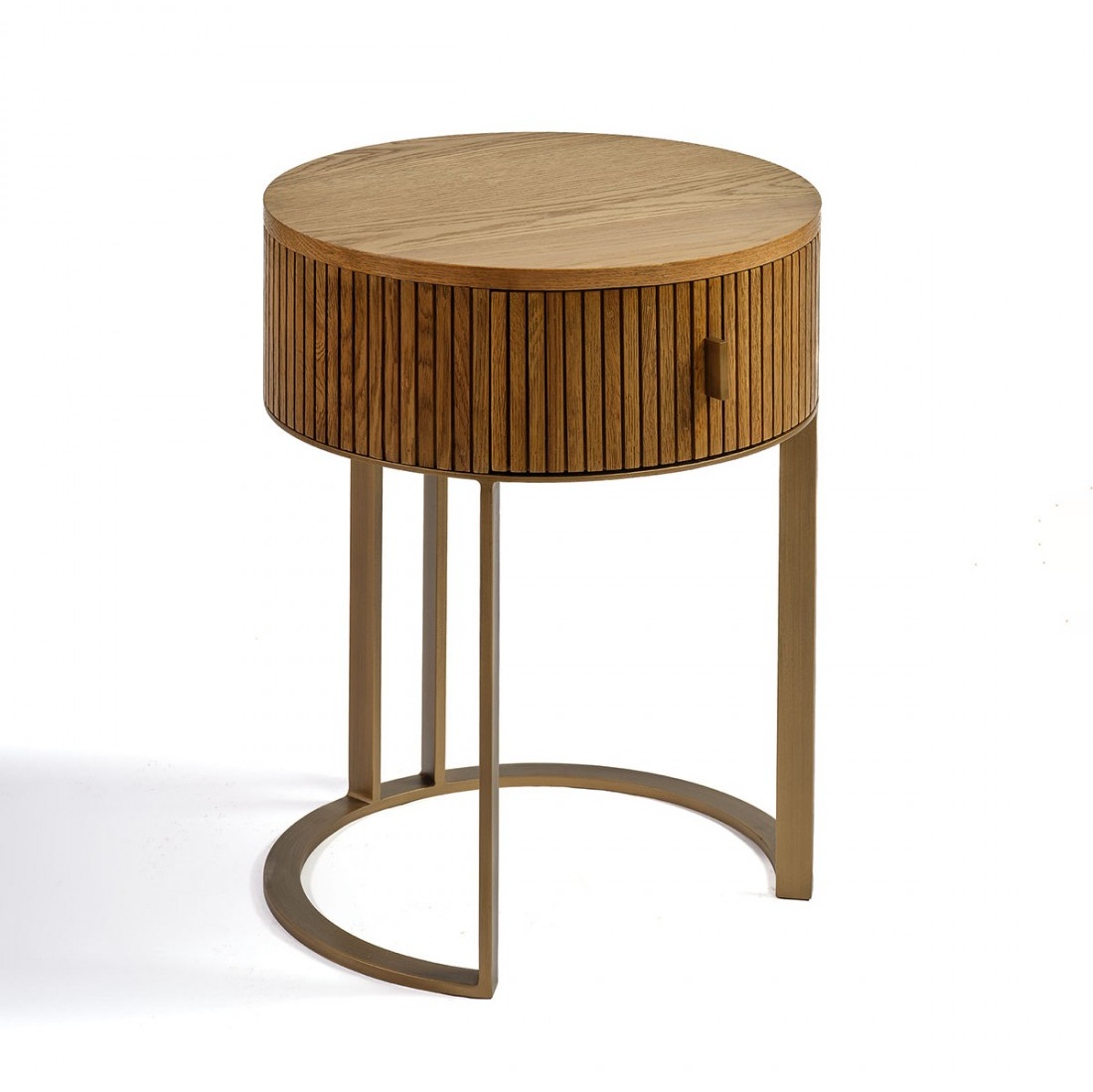 Sofisticada mesita de noche redonda, de diseño vintage e inspiración Art Decó, fabricada en madera de roble color natural con base de metal dorado envejecido.