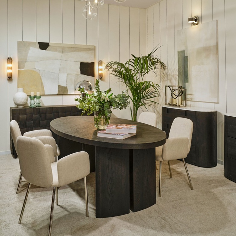 Espectacular mesa de comedor ovalada de gran tamaño, de diseño moderno e inspiración nórdica, fabricada en madera de roble con elegante acabado en color black brown y originales patas en los laterales.