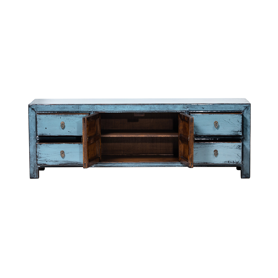 Exclusivo mueble de televisión de diseño oriental e inspiración rústica fabricado en madera de pino con precioso acabado en color azul y marcados desgastes.