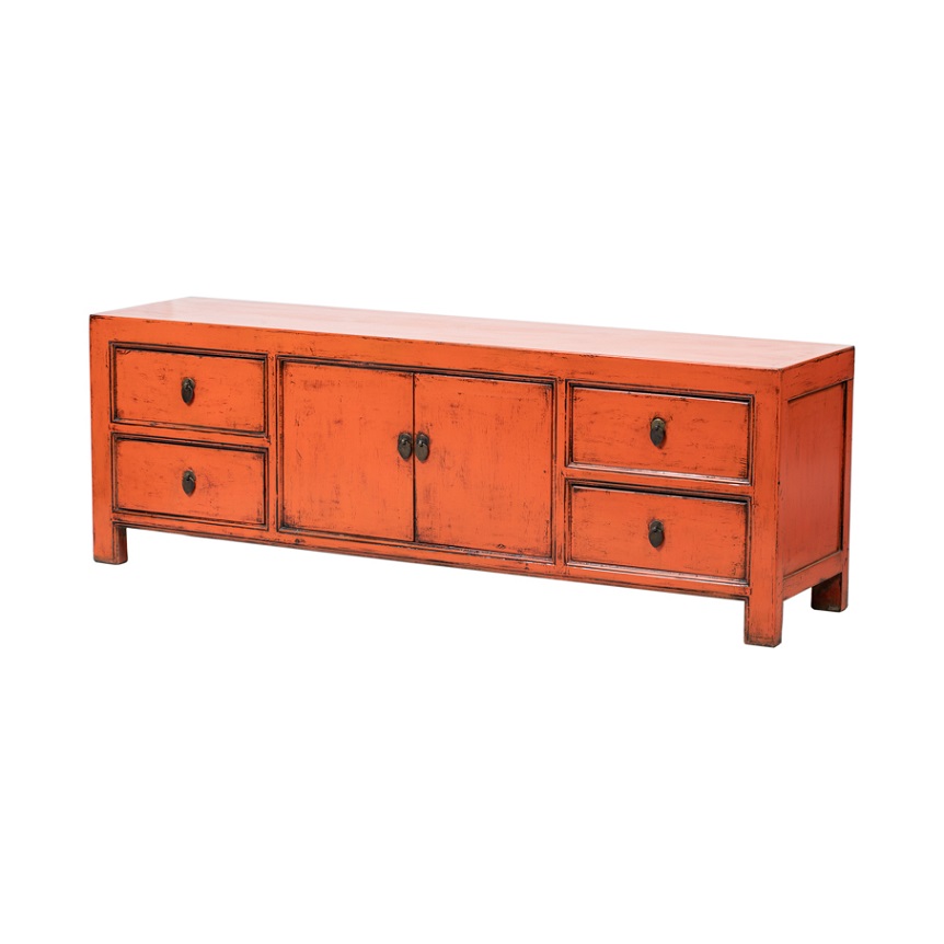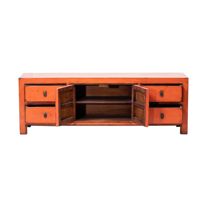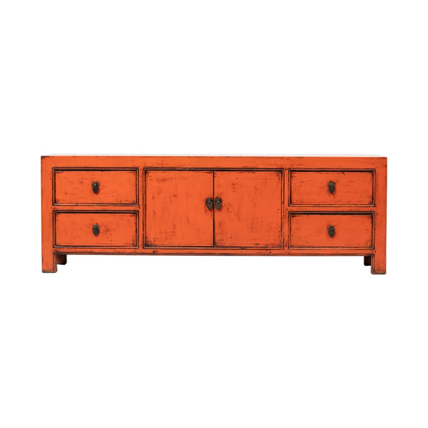 Precioso y original mueble de televisión de diseño oriental fabricado en madera de olmo con elegante acabado desgastado en color naranja y bonitos tiradores metálicos en puertas y cajones.