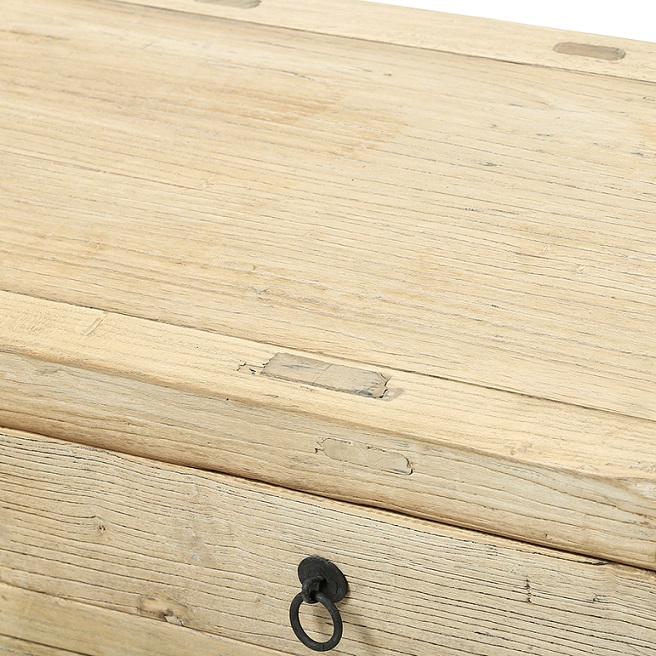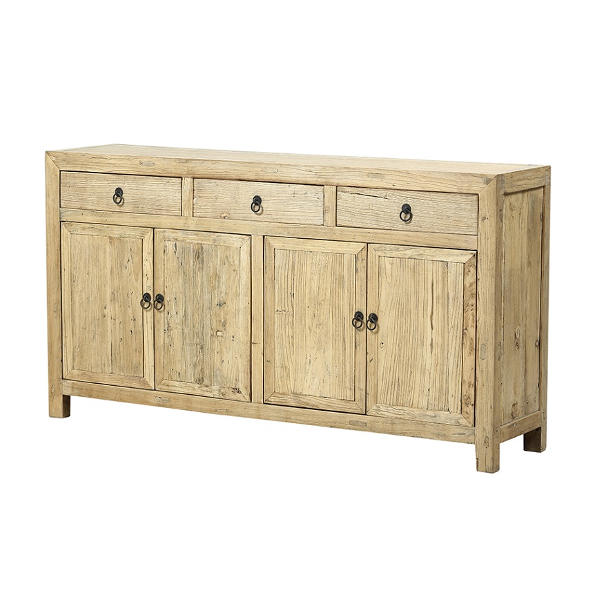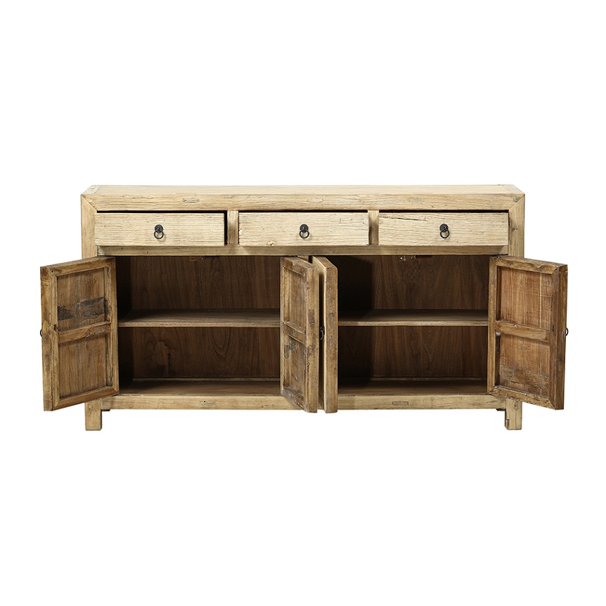 Elegante y robusto aparador de 4 puertas de estilo oriental e inspiración rústica fabricado en madera de pino con precioso acabado en color natural con desgastes. Con sus característicos tiradores metálicos y 3 prácticos cajones.