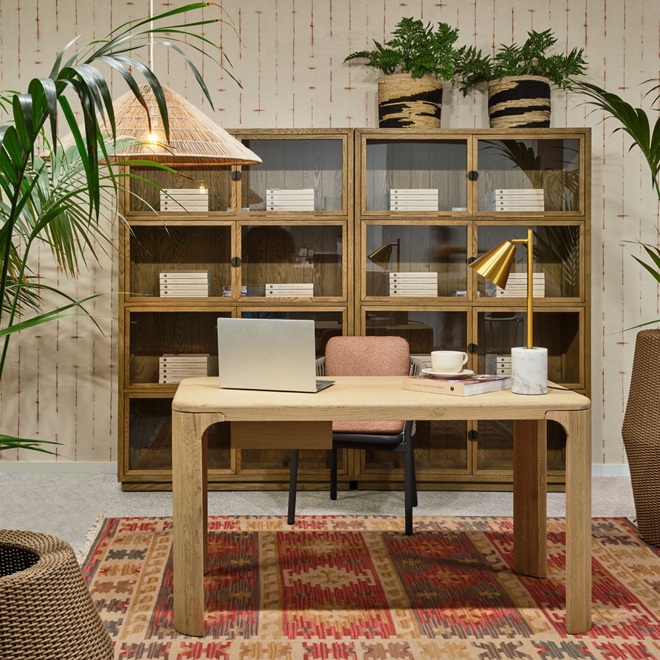 Precioso y práctico escritorio, de diseño moderno e inspiración nórdica, fabricado en madera de roble con bonito acabado natural y formas redondeadas.