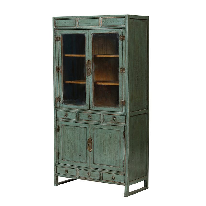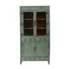 Preciosa y trabajada vitrina estilo oriental fabricada en madera de álamo con original acabado en color verde con marcados desgastes. Con originales tiradores metálicos y 6 prácticos cajones. Dispone de 2 baldas interiores removibles.