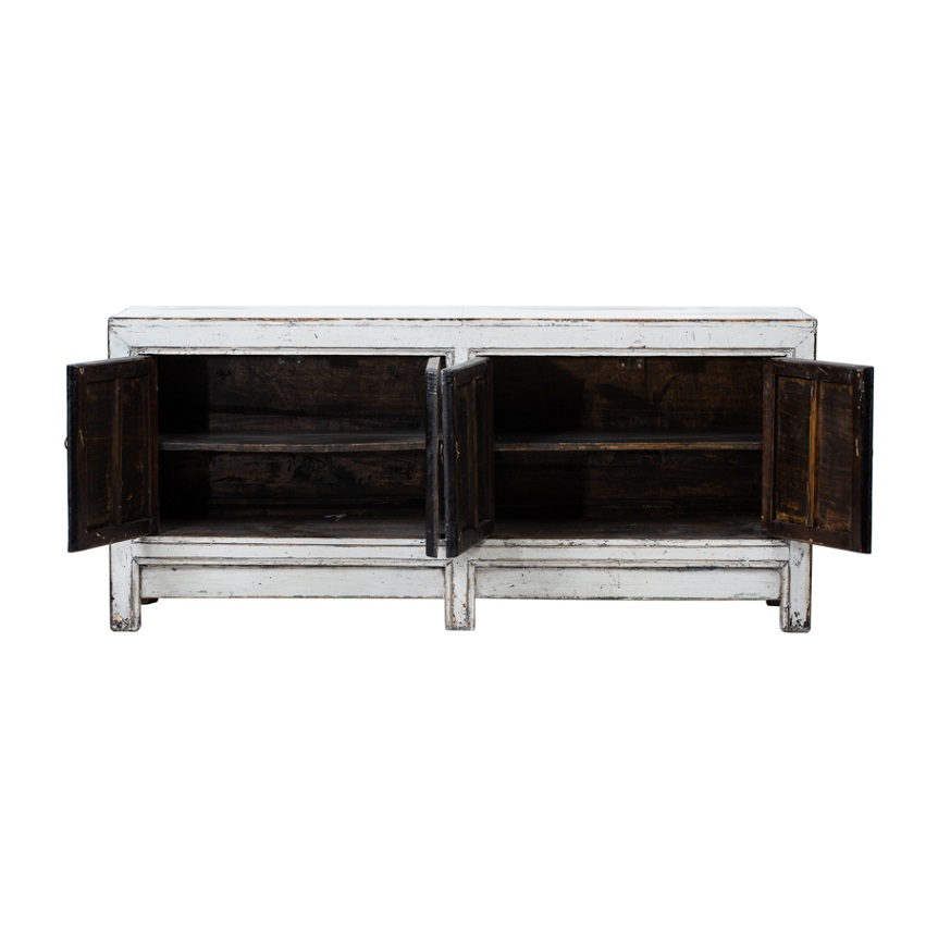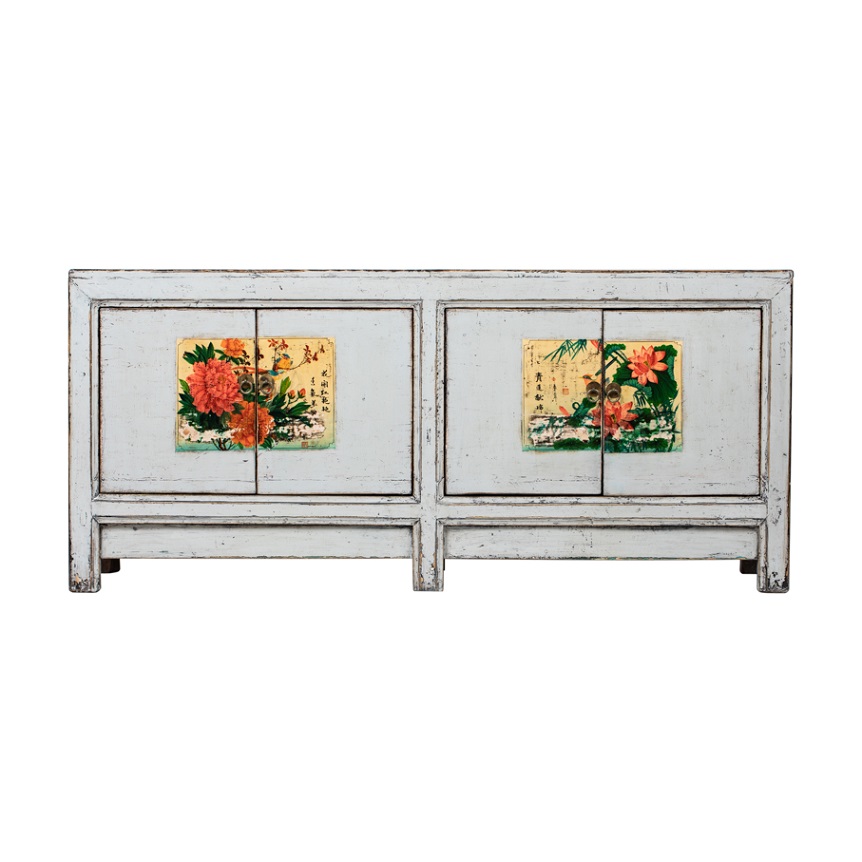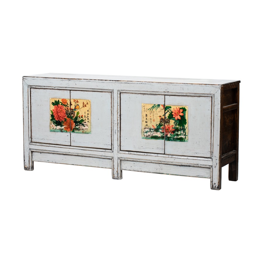 Precioso y original aparador de diseño oriental fabricado en madera antigua de álamo con elegante acabado desgastado en color gris y delicados motivos florales en sus 4 puertas.