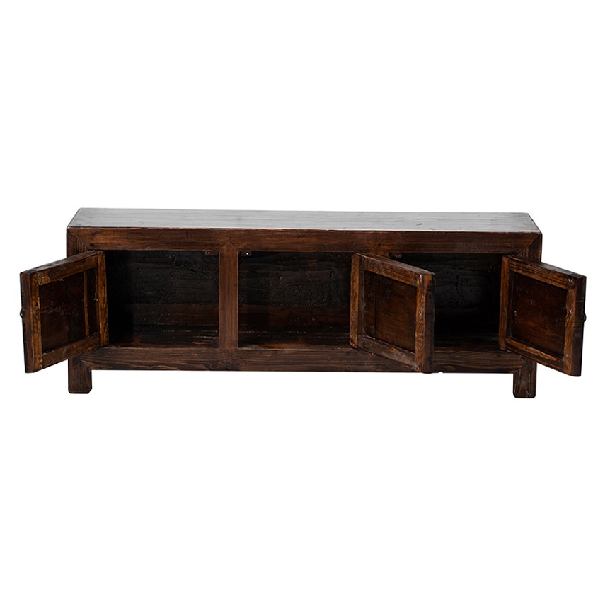 Precioso y trabajado mueble de televisión de diseño oriental fabricado en madera antigua de álamo con elegante acabado desgastado en color marrón. Tiene 3 puertas con delicados motivos florales y bonitos tiradores metálicos.