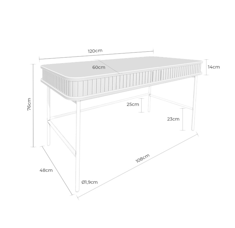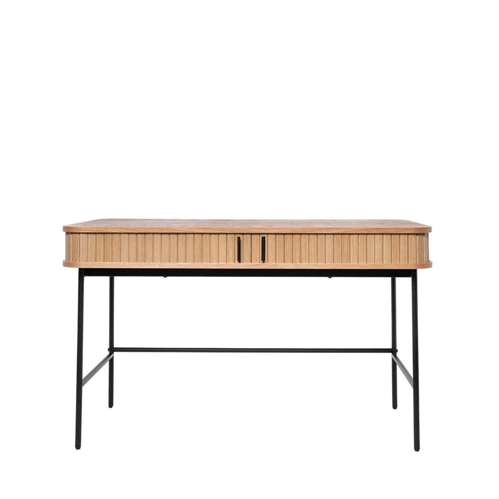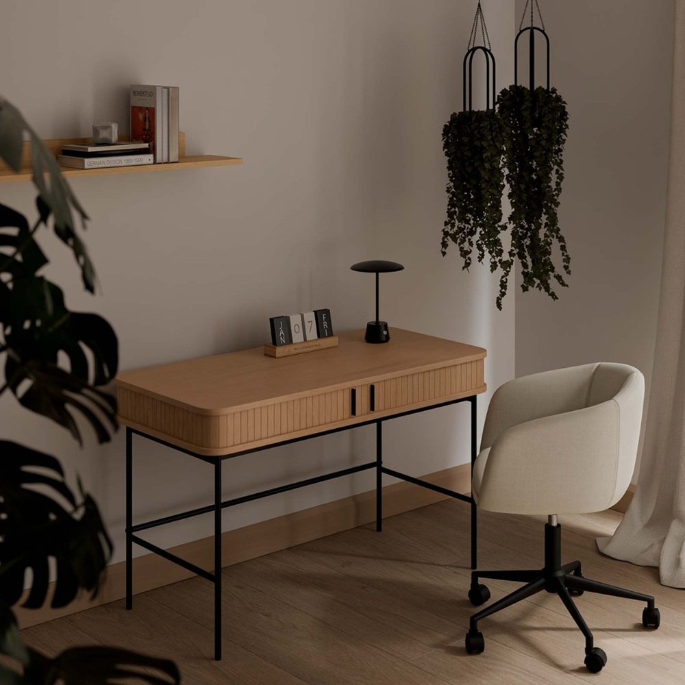 Funcional y práctico escritorio de diseño nórdico e inspiración minimalista y moderna con estructura fabricada en chapa de madera de roble con cajón con apertura de puertas correderas, un detalle que potencia su comodidad de uso. Sobre patas de metal color negro que requieren de su montaje.