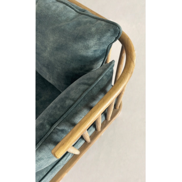 Precioso sillón butaca, de diseño moderno e inspiración vintage, con original estructura de madera de roble y tapizada en terciopelo color azul con cojines desenfundables.