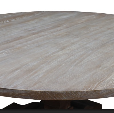 Robusta mesa de comedor redonda, de diseño clásico e inspiración rústica, fabricada en madera de roble en acabado natural con pata central tallada y tablero de 4,2cm de grosor.