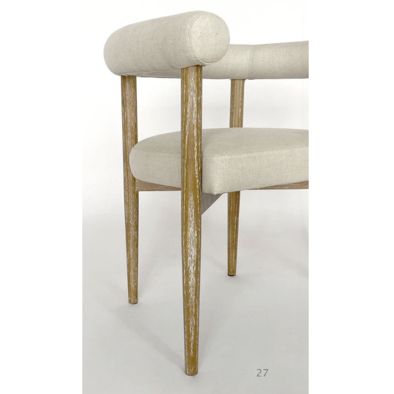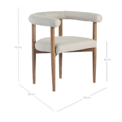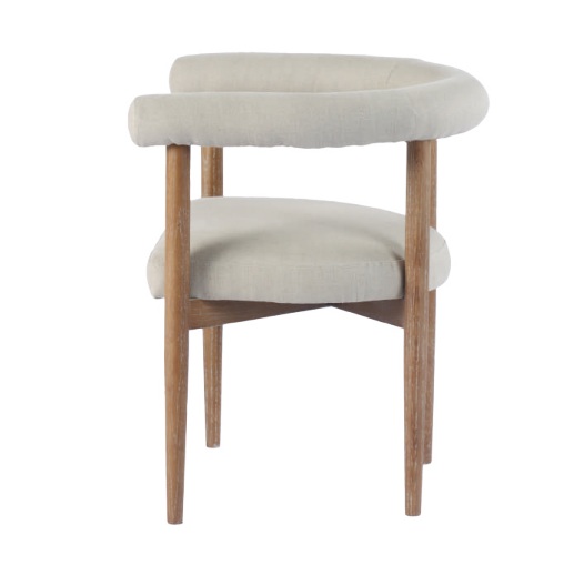 Elegante y confortable sillón con reposabrazos, de diseño moderno e inspiración nórdica, con estructura de formas redondeadas en madera de roble decapada y tapizado en lino color beige.
