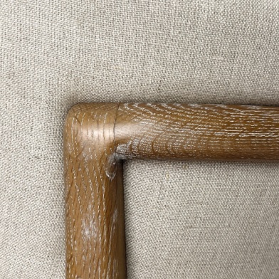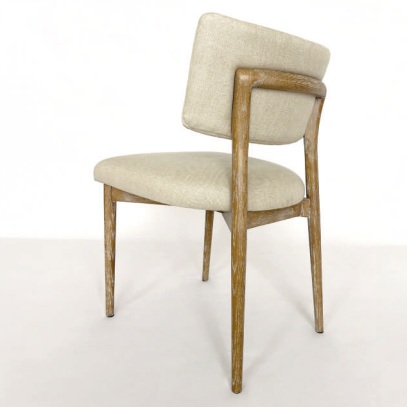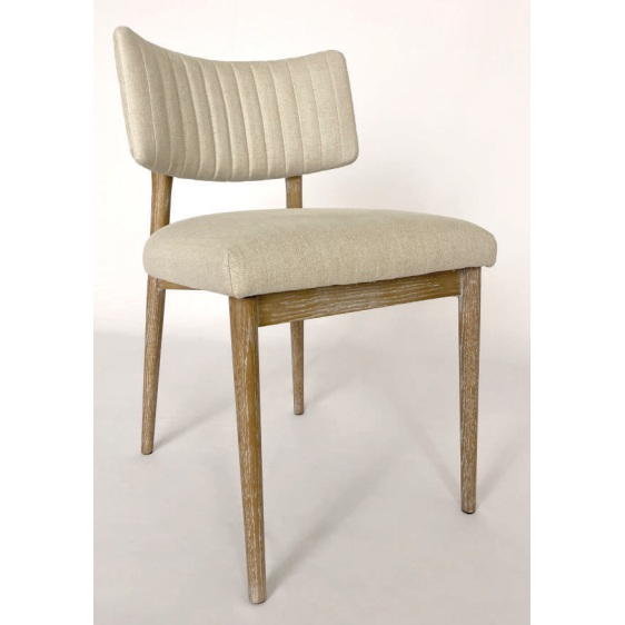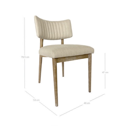 Elegante silla, de diseño moderno e inspiración nórdica, con estructura de madera de roble en acabado natural y tapizado en precioso lino beige con detalle de costuras verticales en el respaldo.