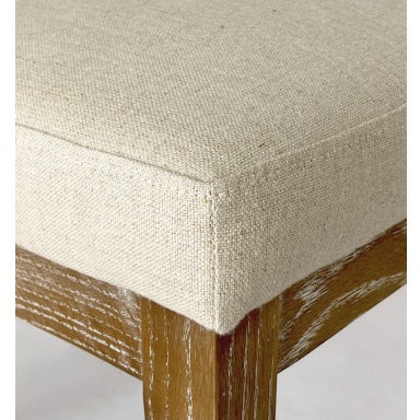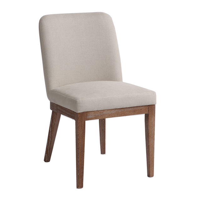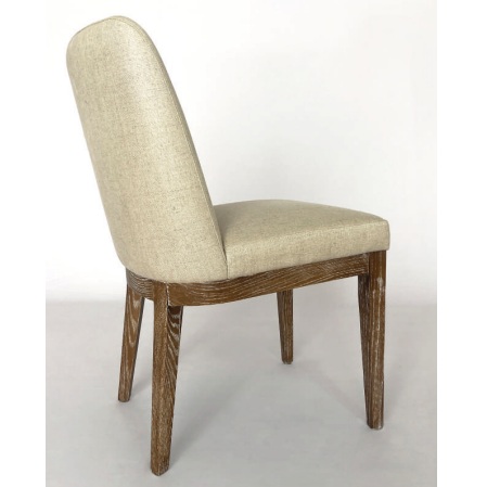 Irresistible y confortable silla, de diseño clásico e inspiración nórdica, con estructura de madera de roble decapado y elegante tapizado en lino color beige.