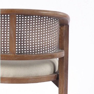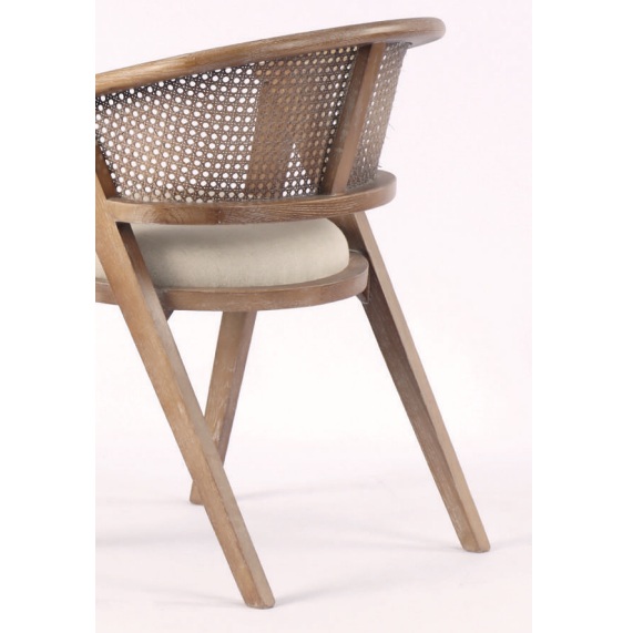 Precioso sillón con reposabrazos, de diseño vintage e inspiración rústica, con estructura de madera de roble decapada, asiento tapizado en lino beige y original respaldo curvado de rejilla fabricado en enea.